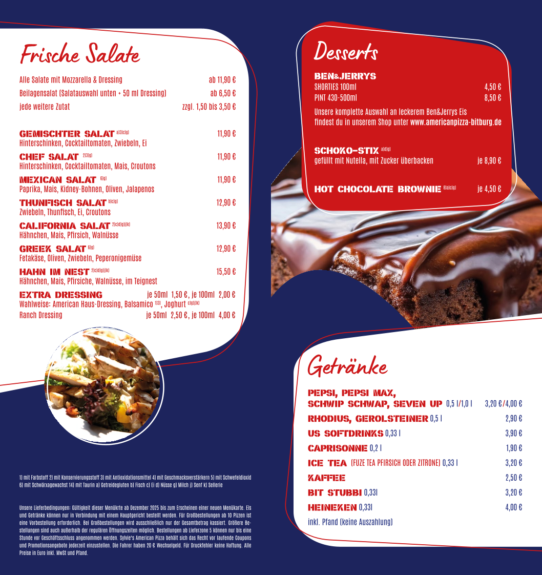 The Frische Salate (fresh salads) are a great option for those looking for a refreshing, healthy side. The Gemischter Salat (mixed salad), Chef Salat, and Mexican Salat offer a variety of flavors, while the Thunfisch Salat (tuna salad) and California Salat provide even more variety for salad lovers.